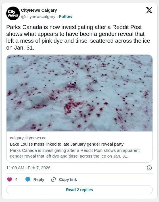 不过,Reddit一则帖子曝光1月31日路易斯湖(Lake Louise)冰面上疑似举办一场“性别揭晓派对”,留下大片粉色染料和金属亮片,严重破坏自然环境。