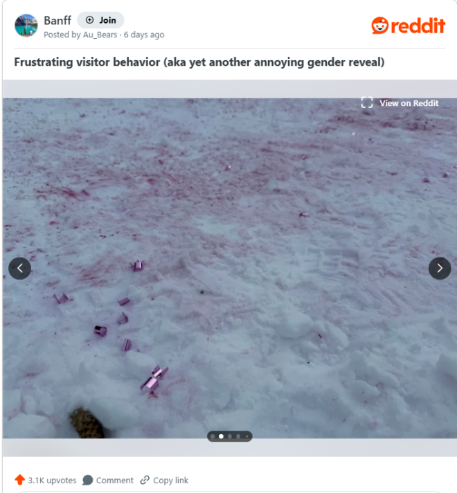 这名Reddit发帖者同意接受CityNews的电话采访,但前提是不出镜且不公开姓名。她在采访中表示:“那一片区域的雪地上布满粉色痕迹,还有几百片细小的金属纸屑,我几乎可以确定那是性别揭晓活动留下的残留物”。