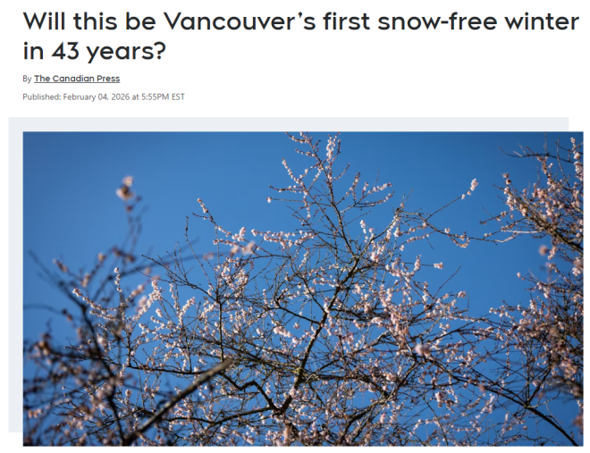 截至目前,温哥华国际机场(YVR)气象站仍未正式记录到任何降雪。这也意味着,如果接下来几周情况不变,温哥华有可能迎来自 1982—1983 年冬季以来,整整 43 年里的第一个“无雪冬天”。