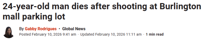 当地警方表示,2月9日晚上10点刚过,Burlington Centre Mall商场外(Guelph Line与Fairview Street附近)发生一起枪击事件,导致一名24男子当场身亡。