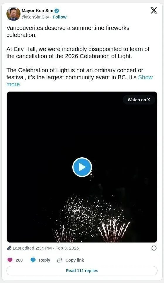 先说背景。办了三十多年的“光之庆典”,从Symphony of Fire到Celebration of Light,一直是温哥华最有辨识度的公共活动之一。问题是,近几年成本一路飙升,联邦政府的拨款从2023年的约45万加元直接降到2025-26年的零,省里的支持十几年没涨,实际购买力反而缩水,企业赞助也越来越难拉。主办方去年底直接摊牌:扛不住了,无限期停办。