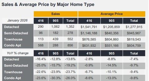 1月GTA独立屋平均价格同比下降7.4%,至$1,277,915;公寓平均价格同比下降9.8%,至$604,759。