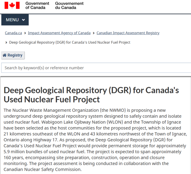 目前被看中的地点,位于伊格纳斯镇(Township of Ignace)和瓦比贡湖奥吉布韦原住民社区(Wabigoon Lake Ojibway Nation)附近,距离雷湾(Thunder Bay)西北大约250公里。这里可能成为加拿大首个深层地质核废料储存库。