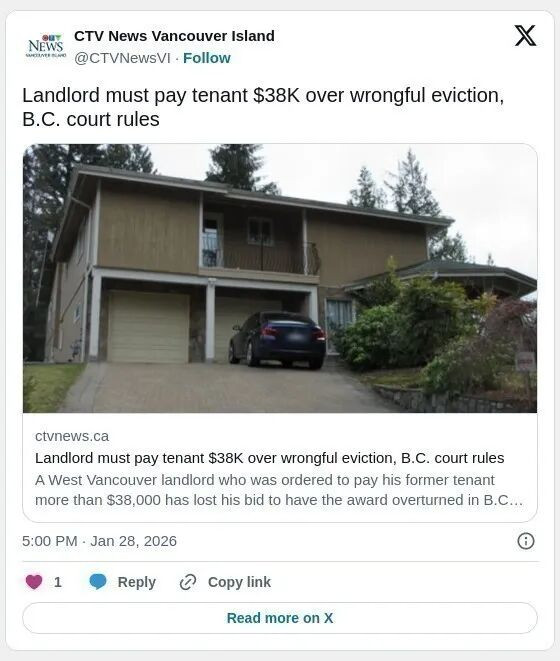 本案租客于2025年初向RTB申诉,指控房东在他搬离后并未连续居住满6个月。审理此案的RTB仲裁员同意该指控,并裁定 房东向租客支付38,596加元,相当于12 月原租金,另加100加元 的 RTB申请费。