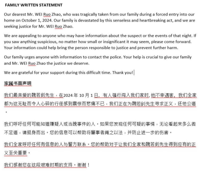 警方在周一发布的新闻稿中表示:“在对峙过程中,55岁的屋主Ruo Zhao Wei中枪,随后在医院因伤势过重死亡。”