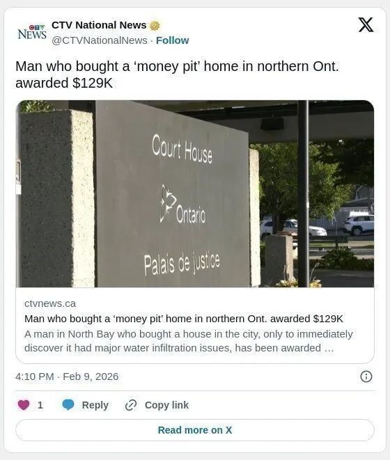 加拿大安省北湾市(North Bay)一名男子购买新房后,立即发现房屋存在严重漏水问题。安大略高等法院法官近日裁定,该男子可获得129,000加元赔偿,同时他还与房屋验房师达成庭外和解,获得10,000加元补偿。