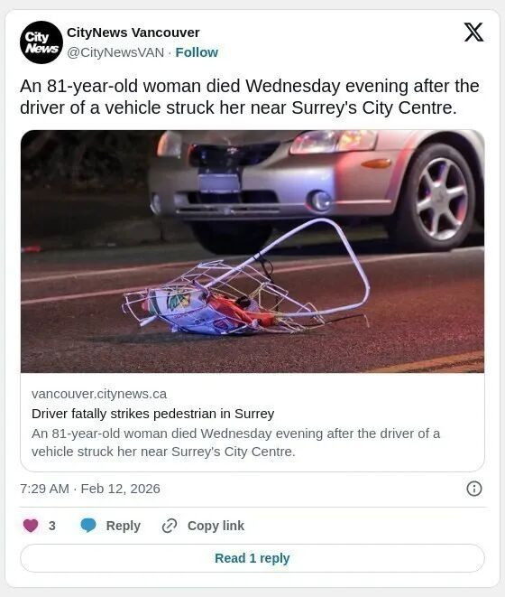 警方表示:“素里警察局一线警员与素里消防局和BC省紧急医疗服务队一同赶到现场。尽管采取了急救措施,但这位45岁的女性行人不幸因伤势过重身亡”。