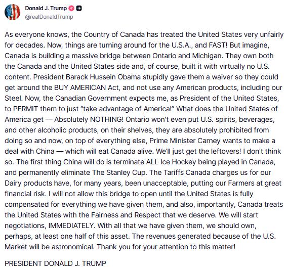 在周一的一条社交媒体帖子中,特朗普表示,美国应该拥有该桥“至少一半的所有权”,并称通向美国市场的通行收益将是“天文数字”。他还声称,加拿大控制了桥的两端。