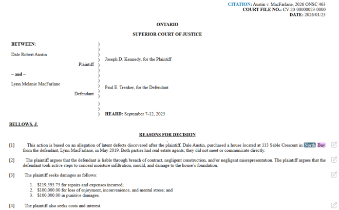 一名来自安省北湾市(North Bay)的男子,买下一套房子后不久就发现存在严重的渗水问题。安省高等法院一名法官裁定,卖方需向他赔偿12.9万加元。