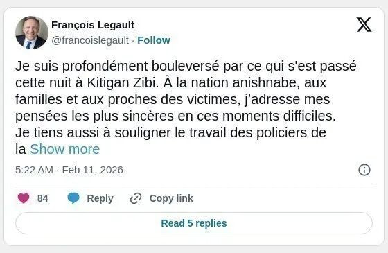 勒戈在社交媒体上写道:“昨晚在基蒂根·齐比发生的事情让我深感震惊”,“在这个艰难的时刻,我向阿尼什纳贝族、遇难者家属和亲友致以最诚挚的慰问”。