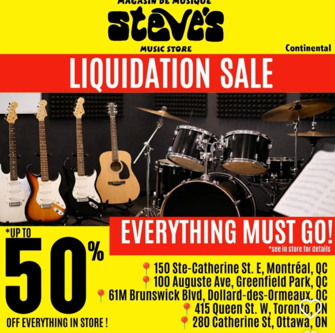 加拿大60年老牌乐器连锁店Steve's Music近日宣布,即将关闭渥太华、多伦多和蒙特利尔几乎所有的实体店。