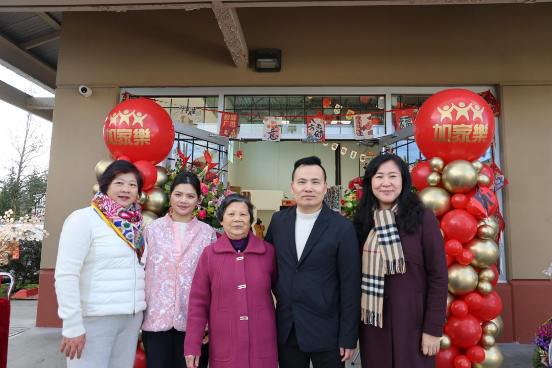 在剪彩环节,加家樂老板Raymond与Eileen、中华会馆理事长钱华女士、社区代表龙波女士、加拿大大华笔会会长冯玉女士及亲友团代表共同手持剪刀,为加家樂剪出一条辉煌的蓬勃发展之路。