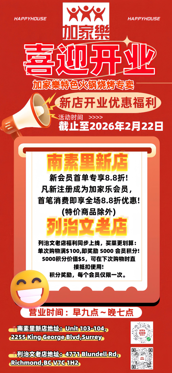 - 列治文老店:为感恩老顾客的厚爱,列治文店同步开启积分大放送。活动期间,单次购物满$100,即可奖励5000会员积分(价值$5),可直接用于下次购物抵扣。积分活动,每个会员仅限一次。