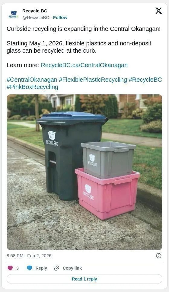 非营利机构Recycle BC表示,软塑料此前只在回收站点接受投放。如今,凡是在温哥华使用Recycle BC回收服务的公寓和共管公寓楼,居民都可以在自家楼内使用粉色回收箱。该机构称,目前约有4,500个粉色回收车(carts)正在陆续投放。