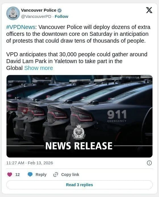 温哥华警方表示,警方将于周六向市中心增派数十名警员,以应对可能吸引数万人参加的抗议活动。